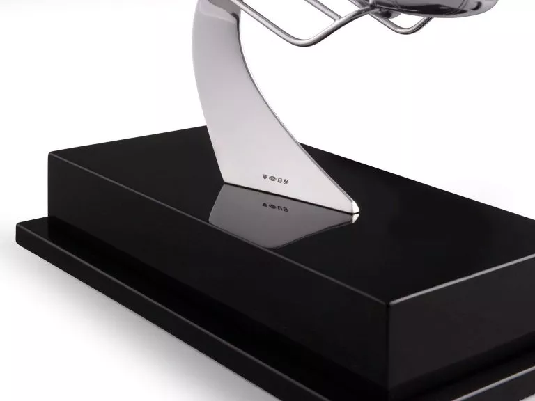 Every piece is fully hallmarked and displayed on a high- gloss black plinth. A sterling silver engraved inscription plate can be supplied at your request.